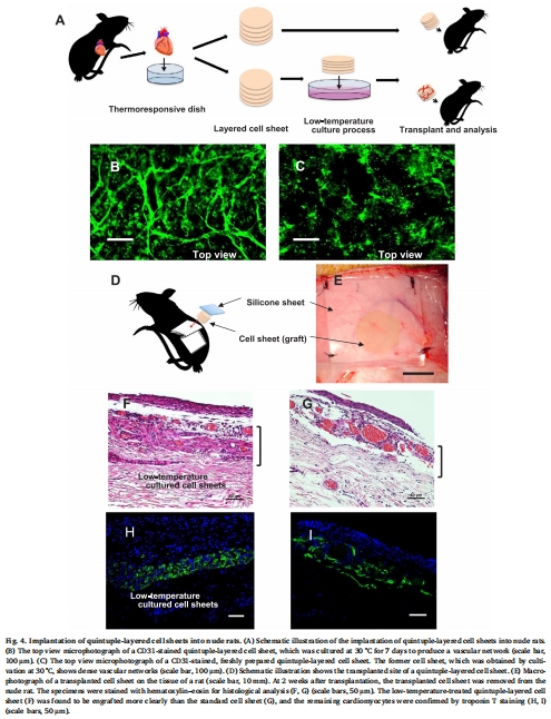 數(shù)據(jù):低溫處理(30°C)的五層細(xì)胞片移植后血管網(wǎng)絡(luò)更密集(Fig. 4B-C),組織存活率更高(Fig. 4F-H),肌鈣蛋白T陽性區(qū)域面積增大(11,530±4550 μm2 vs 標(biāo)準(zhǔn)處理8,302±2700 μm2)。