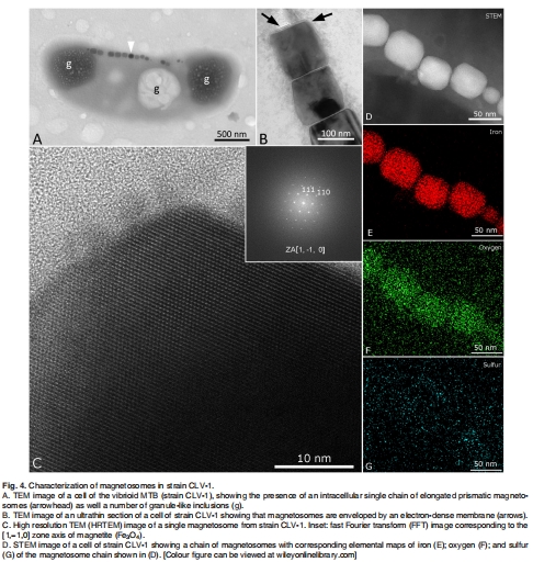 數據:磁鐵礦晶體形態因形態型異:螺旋菌為立方八面體(尺寸27.0-70.9 nm),球菌和弧菌為細長棱柱形(尺寸27.3-178.1 nm),桿菌為子彈形(尺寸45.9-114.2 nm);所有晶體為單域磁鐵礦。