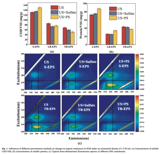 1 測量了可溶性化學需氧量和蛋白質濃度在胞外聚合物中的變化,數據來自Fig.1a和Fig.1b。研究意義是評估污泥解體程度和有機物釋放效率,表明協同預處理能促進緊密結合胞外聚合物的破壞,增強后續生物降解。