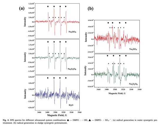 3 測量了電子順磁共振光譜以檢測自由基,數據來自Fig.4。研究意義是確認超聲活化過程中羥基自由基和硫酸根自由基的產生,證明高級氧化過程的機制。