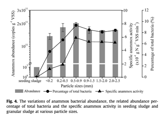 3 測量了厭氧氨氧化細菌豐度,通過定量PCR檢測hzsB功能基因,數據來自Fig.4。研究意義是了解微生物豐度與顆粒尺寸的關系,顯示0.5-0.9毫米尺寸下豐度最高,支持高活性。