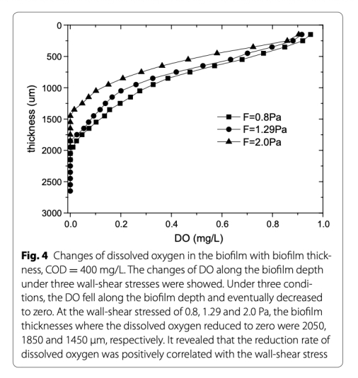 2 測量了溶解氧沿生物膜深度的分布,數據來自Fig. 4。研究意義是揭示氧氣滲透受剪切應力影響,溶解氧減少率與剪切應力正相關,例如在2.0 Pa時氧氣滲透深度最小(1450 μm),表明剪切應力改變微生物環境,影響甲烷形成。