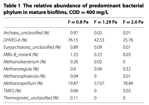 3 測量了微生物群落組成,數據來自Fig. 5和Table 1。研究意義是分析古菌物種豐度,顯示Methanospirillum和DHVEG-6為優勢種,但比例隨剪切應力變化,例如Methanospirillum在2.0 Pa時占78.84%,表明剪切應力影響產甲烷菌活性。