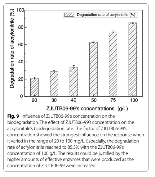 5 數(shù)據(jù):菌濃度對降解率的影響,來自Fig.9。研究意義:菌濃度100 g/L時降解率達85.3%,證明高菌量可提供更多有效酶,強化降解能力。