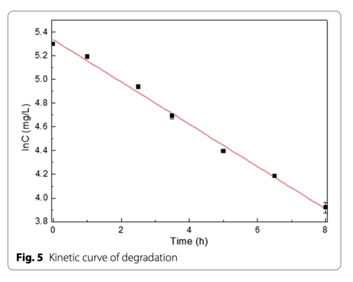 2 數(shù)據(jù):丙烯腈降解動力學曲線和方程,來自Fig.5。研究意義:動力學方程lnC=-0.1784t+5.3349符合一級反應模型,半衰期3.885小時定量評估降解效率,為實際應用提供參數(shù)依據(jù)。