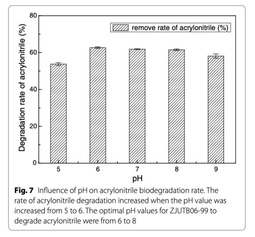 3 數(shù)據(jù):pH對降解率的影響,來自Fig.7。研究意義:pH 6-8時降解率最高,揭示菌株和關鍵酶在弱酸性條件下的適應性,指導廢水pH調(diào)控。