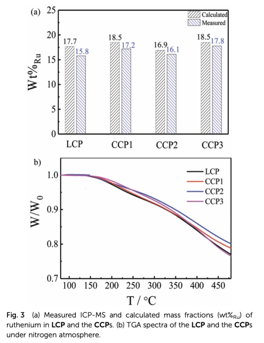 1 數據:FTIR光譜、固體狀態13C-NMR光譜、ICP-MS測定的Ru含量、TGA熱穩定性分析,來自Fig.2和Fig.3。研究意義:這些數據驗證了聚合物的成功合成和結構完整性,FTIR和NMR確認官能團,ICP-MS定量Ru摻入,TGA顯示熱穩定性,為催化劑基礎性能提供依據。