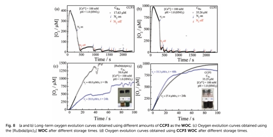 4 數據:長期氧氣演化曲線、存儲穩定性測試,來自Fig.8。研究意義:長期實驗顯示催化劑穩定性,CCP3在存儲后活性增強,表明三維交聯結構防止自氧化和配體解離,提升耐久性。