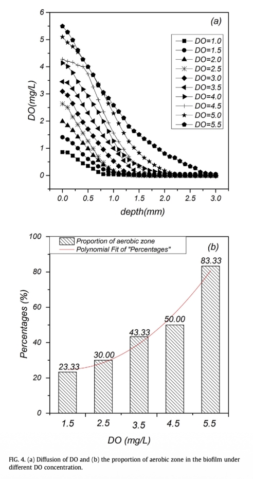 2 數(shù)據(jù):DO微電極剖面和好氧區(qū)比例,來自Fig.4。研究意義:Fig.4a顯示DO濃度增加導(dǎo)致氧滲透厚度增加(1.0-2.7 mm),F(xiàn)ig.4b表明好氧區(qū)比例從23.3%增至83.3%,直接揭示DO擴(kuò)散如何影響生物膜分層,為理解微生物空間分布提供基礎(chǔ)。