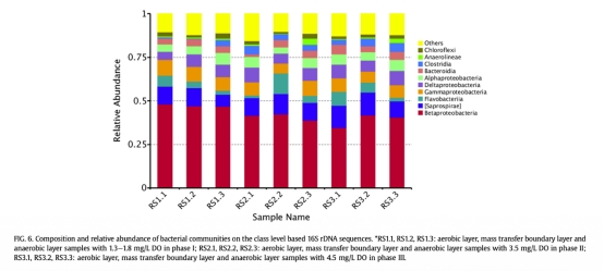 摘要部分闡述了本研究在序批式生物膜反應(yīng)器(SBBR)中調(diào)查了溶解氧濃度(DO)對同步硝化反硝化(SND)過程中生物膜微生物群落的影響。實(shí)驗(yàn)在不同DO濃度(1.5、3.5和4.5 mg/L)下進(jìn)行,評估氮去除率和細(xì)菌群落變化。當(dāng)DO為2.5 mg/L時(shí),SND率最高達(dá)95.22%,化學(xué)需氧量(COD)和氮去除率分別為92.22%和84.15%。反硝化過程隨氧濃度增加而受抑制。微電極測量顯示,DO濃度從1.5 mg/L增至5.5 mg/L時(shí),氧滲透厚度從1.0 mm增至2.7 mm。高通量測序分析表明,生物膜群落結(jié)構(gòu)相似,以Uliginosibacterium、Zoogloea和Acinetobacter為主。好氧層以Betaproteobacteria和Saprospirae為主,厭氧層以Anaerolineae為主。實(shí)時(shí)PCR顯示氨氧化細(xì)菌(AOB)和亞硝酸鹽氧化細(xì)菌(NOB)數(shù)量與Nitrospirales和Nitrosomonadales豐度匹配。研究表明DO濃度顯著影響SND系統(tǒng)中關(guān)鍵細(xì)菌群落的動(dòng)態(tài)。