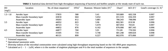 5 數(shù)據(jù):生態(tài)多樣性指數(shù)(如Shannon指數(shù)、Chao1),來自Table 3。研究意義:Table 3提供OTU數(shù)量和多樣性指標(biāo),顯示厭氧層多樣性最高,表明低DO促進(jìn)物種豐富度,有助于評估生物膜抗逆性。