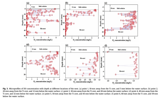 2 數(shù)據(jù):DO濃度隨生物巢深度的微剖面,來自Fig.3。研究意義:微電極測量顯示DO能滲透到50mm深度,且濃度波動表明氧傳輸在厘米尺度不受限,這揭示了生物巢內(nèi)部的好氧環(huán)境支持微生物活動,挑戰(zhàn)了傳統(tǒng)生物膜厚度限制的認知。