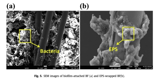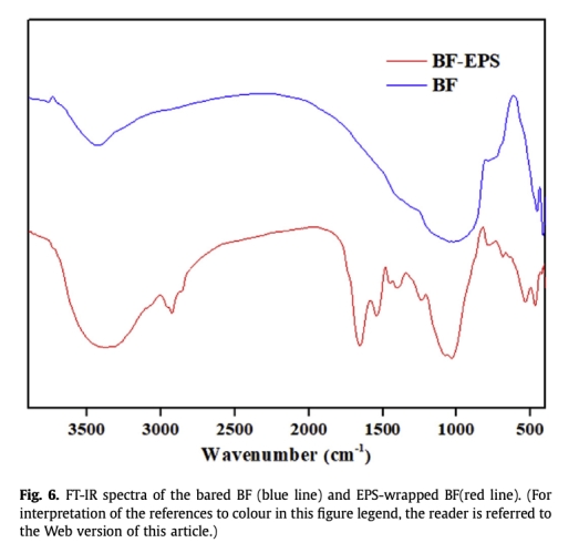 4 數(shù)據(jù):生物膜吸附特性和EPS功能團分析,來自Fig.5和Fig.6。研究意義:SEM圖像顯示BF被生物膜緊密包裹,F(xiàn)TIR光譜揭示EPS中的多糖和蛋白質(zhì)功能團(如C=O、C-N)在吸附和交叉鏈接BF中起主導(dǎo)作用,這解釋了生物巢結(jié)構(gòu)穩(wěn)定性的機制,為載體設(shè)計提供了分子水平見解。