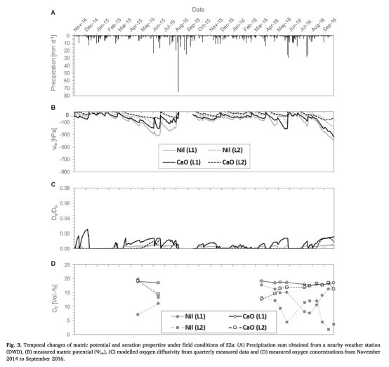 3 現場監測數據:包括基質勢(Ψm)和氧氣濃度,定期測量。數據來自Fig.2、Fig.3和Fig.4。研究意義是評估實際田間條件下生石灰的效果,考慮水分動態對通氣性的影響。