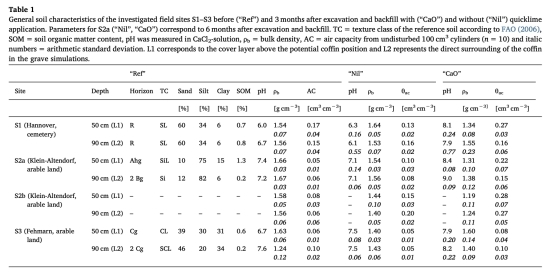 摘要描述了墓穴土壤因常見挖掘和回填實踐導致土壤結構破壞,影響氣體和水分傳輸功能,可能導致分解問題,如氧氣不足。研究測試了生石灰(CaO)應用作為結構改良方法,以改善墓穴土壤的通氣性。通過在德國三個不同質地地點(沙壤土、粉壤土、粘壤土)設置墓穴模擬(無尸體),比較添加生石灰和不添加的處理,測量擴散性和孔隙功能參數,并進行現場監測。結果表明,生石灰應用提高了擴散性和氧氣濃度,但效果受粘土含量和土壤水分影響。