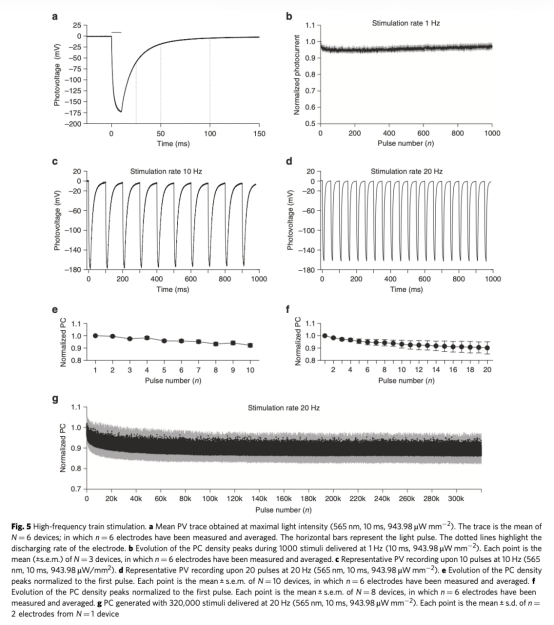 3 高頻刺激響應數據:來自圖5,顯示在20Hz刺激下,光電流響應穩定,320,000次刺激后仍保持88.6%效率。研究意義是證明假體能承受長期重復使用,適合實際應用。