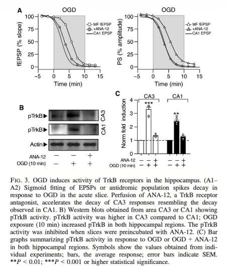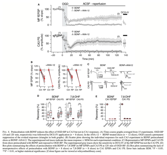 1 數據:電生理記錄顯示OGD-RP導致MF EPSPs和CA3 PS抑制,BDNF或7,8-DHF預處理減少抑制,ANA-12阻斷此效應。研究意義:證實TrkB激活增強CA3區對OGD-RP的抵抗力,表明TrkB在保護電活動中的關鍵作用。來源:圖1、2、4、6。
