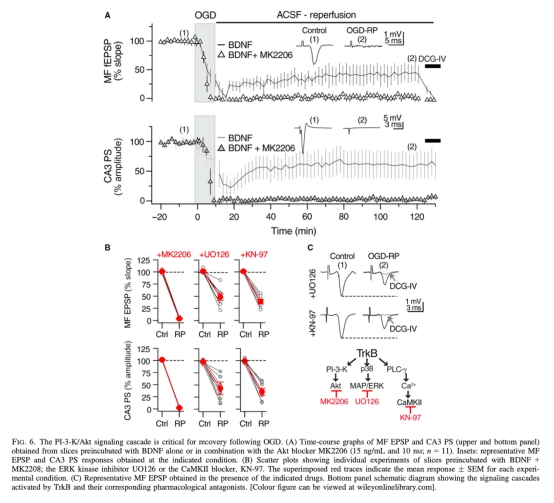 1 TrkB激活通過PI-3-K/Akt信號通路減少OGD-RP對海馬CA3區的損傷,增強電活動恢復和細胞生存。