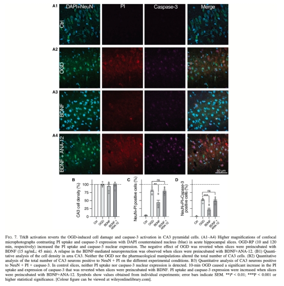 3 數據:碘化丙啶攝取和caspase-3活性檢測顯示OGD-RP增加細胞損傷和凋亡,BDNF預處理減少這些效應。研究意義:表明TrkB激活通過減少細胞死亡和凋亡提供神經保護。來源:圖7。