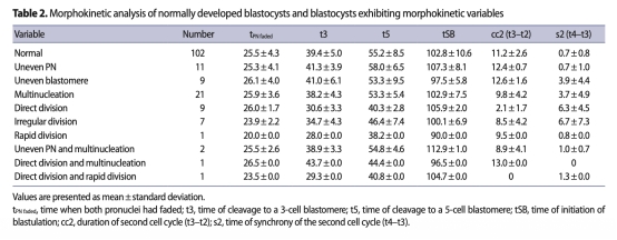 3. 胚胎發(fā)育時間數(shù)據(jù):如tPN faded、t3、t5等時間點,有形態(tài)動力學(xué)變量的囊胚發(fā)育時間變異大,例如直接分裂組t3時間較短(30.6小時 vs. 正常組39.4小時),數(shù)據(jù)來自Table 2。研究意義是發(fā)育時間異常可能反映胚胎內(nèi)在缺陷,與臨床結(jié)果惡化相關(guān)。