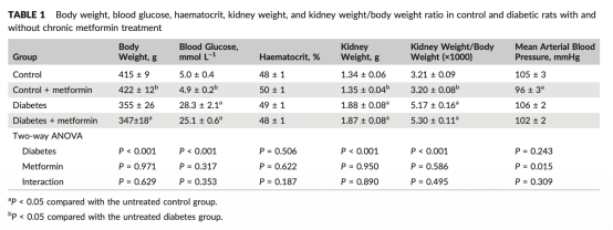 1. 體重、血糖、腎重量等生理參數(shù) [來自表1] - 研究意義是確認(rèn)糖尿病模型成功建立,顯示糖尿病動(dòng)物體重減輕、血糖升高、腎肥大,而二甲雙胍不影響這些參數(shù),表明其效應(yīng)獨(dú)立于血糖穩(wěn)態(tài)。