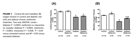 2. 皮質(zhì)和髓質(zhì)氧張力 [來自圖1] - 研究意義是直接證明糖尿病導(dǎo)致腎髓質(zhì)缺氧,二甲雙胍特異性改善髓質(zhì)氧張力而不影響皮質(zhì),突出了其對(duì)髓質(zhì)微環(huán)境的保護(hù)作用。