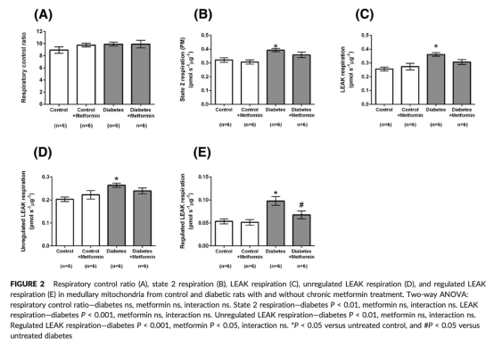 4. 線粒體呼吸參數(shù)(如呼吸控制比、LEAK呼吸、UCP2和ANT敏感呼吸) [來自圖2、圖3和表3] - 研究意義是揭示糖尿病增加線粒體質(zhì)子LEAK,尤其是UCP2介導(dǎo)部分,二甲雙胍選擇性減少UCP2依賴的LEAK,表明其通過改善線粒體效率緩解缺氧。