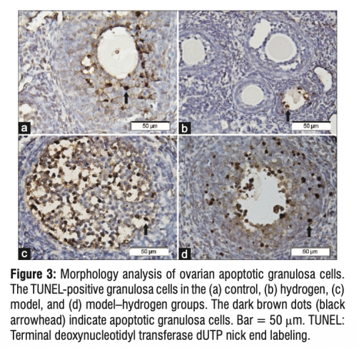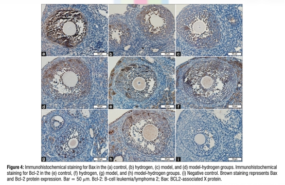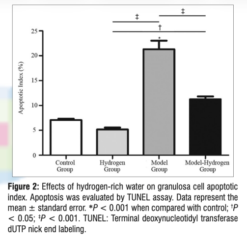 2. 顆粒細胞凋亡指數(shù)(AI):數(shù)據(jù)來自圖2和圖3。模型組GC AI(21.30±1.74%)顯著高于對照組(7.06±0.27%)、氫組(5.17±0.41%)和模型-氫組(11.24±0.58%),模型-氫組GC AI顯著低于模型組。研究意義是GC凋亡增加導(dǎo)致卵巢功能衰竭,富氫水通過抑制凋亡保護卵巢儲備。