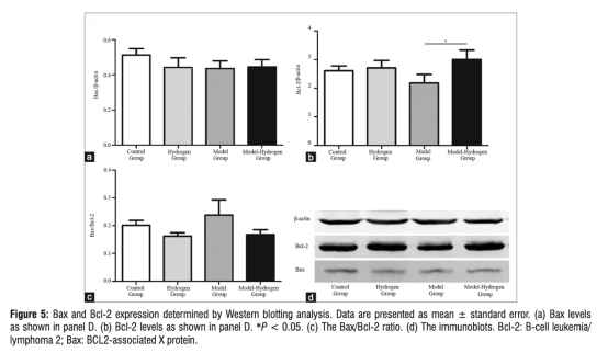 3. Bcl-2和Bax表達:數(shù)據(jù)來自圖4和圖5。模型-氫組Bcl-2水平(3.01±0.33)顯著高于模型組(2.18±0.30),Bax/Bcl-2比率降低。研究意義是Bcl-2/Bax比率作為凋亡“調(diào)節(jié)器”,富氫水通過上調(diào)Bcl-2表達抑制線粒體凋亡通路,從而減少GC凋亡。