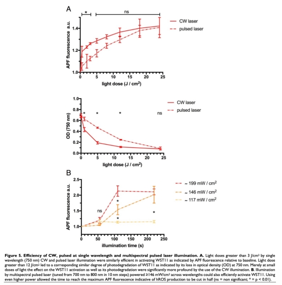 2. 數據:MSOT照明激活WST11的效率數據,顯示脈沖照明在光劑量大于5 J/cm2時與連續波照明相當,能誘導羥基自由基產生。這些數據來自圖5。研究意義:這證明MSOT照明可用于VTP誘導,實現治療診斷一體化,減少對額外設備的依賴。