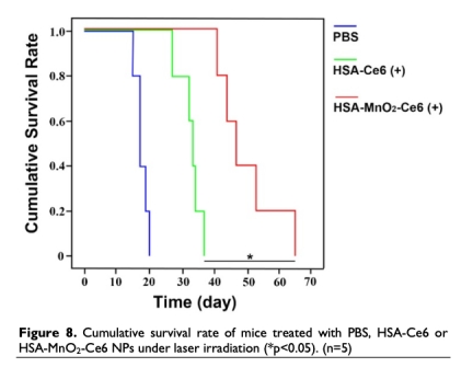 10 來自圖8:生存分析顯示HSA-MnO2-Ce6 NPs加激光照射組小鼠生存期延長。研究意義是表明NPs治療具有長期益處,能提高生存率。
