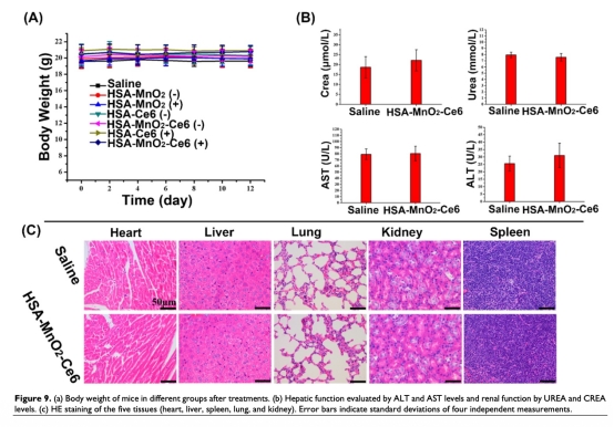 9 來自圖7a和7c:治療實驗顯示,HSA-MnO2-Ce6 NPs加激光照射組腫瘤體積顯著減小,HE染色顯示腫瘤壞死增加。研究意義是證明NPs增強的PDT能有效抑制腫瘤生長。