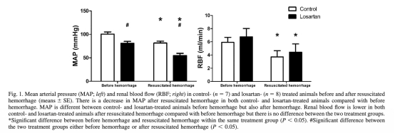 1. 平均動脈壓(MAP)和腎血流量(RBF):數據來自圖1。研究意義是顯示復蘇后出血降低MAP和RBF,但氯沙坦組MAP較低,表明氯沙坦不影響血壓管理,支持其在出血情況下可能安全使用。