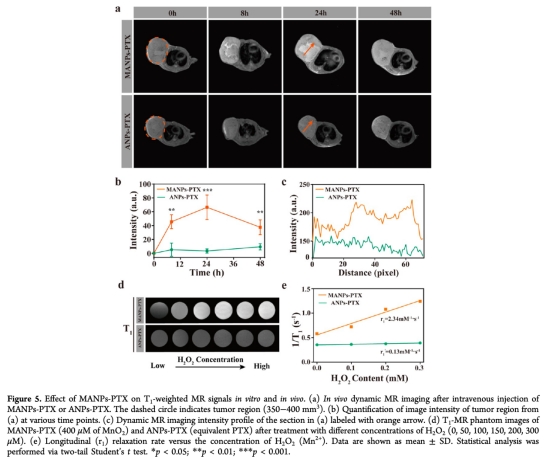 6 數據:MRI性能,通過T1加權成像測量。研究意義:MANPs-PTX在腫瘤中釋放Mn2+,增強T1信號,用于腫瘤檢測和監測。來源:圖5a、b、c、d、e。