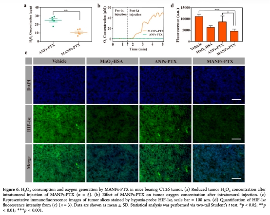 7 數據:體內H2O2消耗和氧氣生成,通過Clark氧氣探頭和H2O2 assay kit測量。研究意義:MANPs-PTX在腫瘤中消耗H2O2并生成氧氣,直接改善缺氧,降低HIF-1α表達。來源:圖6a、b、c、d。