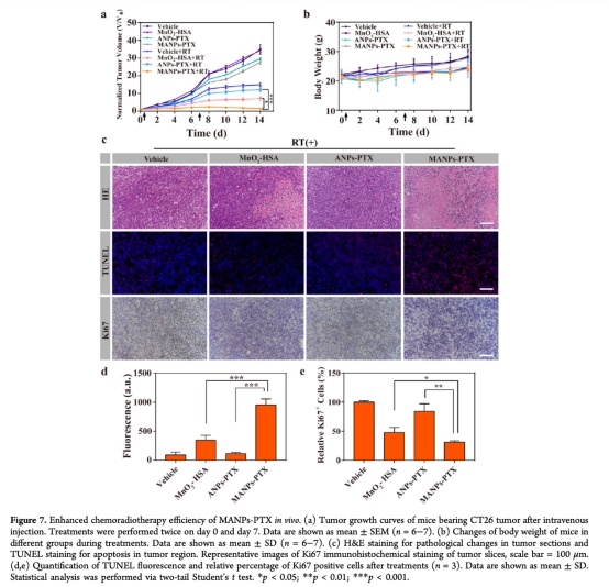 8 數據:體內治療效果,通過腫瘤體積測量和免疫組化評估。研究意義:MANPs-PTX聯合放療顯著抑制腫瘤生長,減少Ki67陽性細胞,增加凋亡,證明治療 efficacy。來源:圖7a、b、c、d、e。