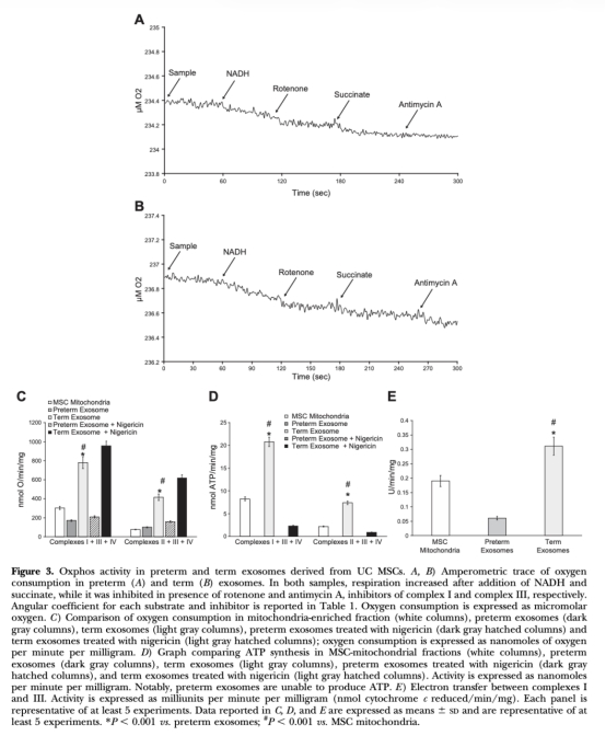 這篇論文的摘要指出,外泌體是分泌性納米囊泡,能夠轉移RNA和蛋白質到靶細胞。研究評估了人類間充質干細胞(MSC)外泌體是否具有線粒體外有氧呼吸能力。外泌體從足月(≥37周)和早產(28-30周)新生兒臍帶MSC中分離,通過細胞熒光術、Western blot、氧測定法和發光/熒光分析進行評估。結果顯示,MSC外泌體表達功能性呼吸復合物I、IV和V,消耗氧氣,但ATP合成僅在足月新生兒外泌體中可檢測到,表明早產外泌體的有氧代謝機制不完整。活動是外向的,與線粒體類似。這揭示了外泌體具有獨立于線粒體的有氧呼吸能力,可能與其修復細胞生物能量學的能力相關,并解釋了早產新生兒的臨床脆弱性。