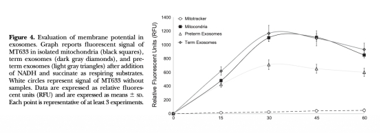 4. 膜電位:使用Mitotracker 633熒光染料評估,顯示外泌體有膜電位,足月外泌體類似線粒體,早產較低。數據來自圖4(文本中提及)。研究意義是表明外泌體能建立質子梯度,為ATP合成提供驅動力,但早產外泌體梯度較弱,影響能量生產。