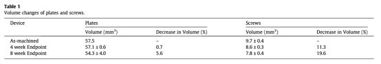 2. 植入物體積變化:通過微CT分析,板和螺釘的體積減少。植入后4周,板體積減少0.7%,螺釘體積減少11.3%;植入后8周,板體積減少5.6%,螺釘體積減少19.6%。這些數據來自表1。研究意義在于驗證H2濃度測量與降解速率的相關性,螺釘降解更快對應更高H2濃度,顯示H2傳感器能有效監測降解過程,并指導植入物設計優化。