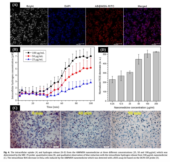 4. 從圖4的細胞內H2釋放檢測使用MB+Pt探針,顯示AB@MSN在細胞內持續釋放H2并降低ROS水平,研究意義是證實納米藥物能在癌細胞內有效釋放H2,降低氧化應激,發揮抗癌作用。