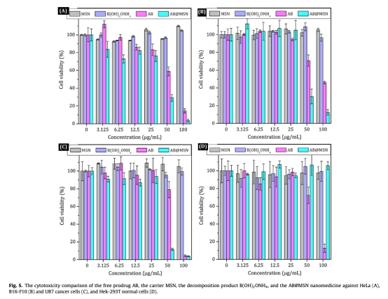 5. 從圖5的細胞毒性測試顯示AB@MSN對癌細胞(HeLa、B16-F10、U87)有顯著毒性,但對正常細胞(Hek-293T)毒性低,研究意義是證明AB@MSN的選擇性抗癌特性,提高治療安全性。