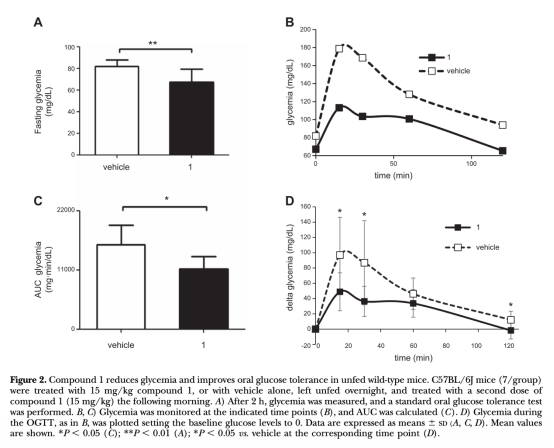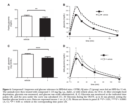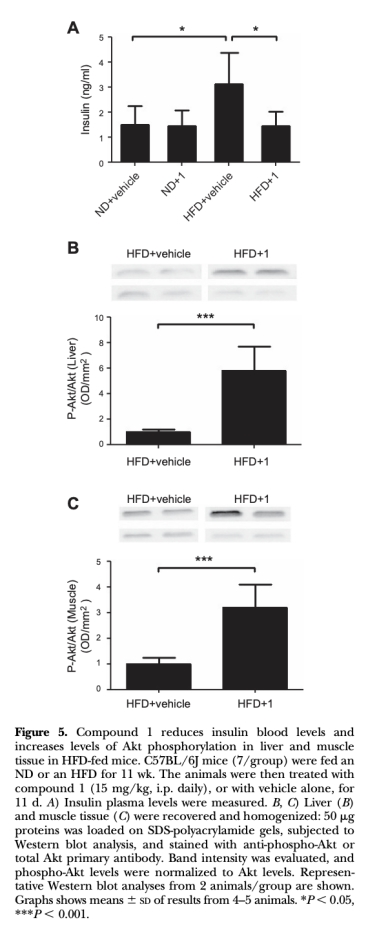 2. 胰島素水平:測量了血漿胰島素濃度。研究意義是評估胰島素敏感性和β細胞功能,化合物1治療降低了HFD小鼠的胰島素水平,表明改善了胰島素抵抗。數據來自圖5。