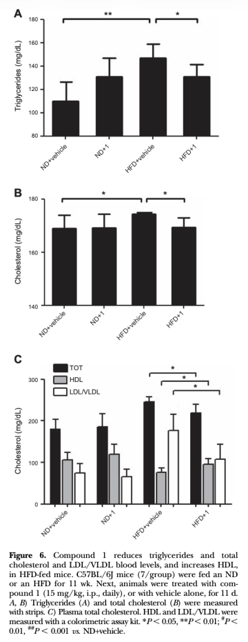 2. 化合物1治療減少了血漿甘油三酯和膽固醇水平,并改善了肝臟脂質代謝,但長期效應需進一步研究。