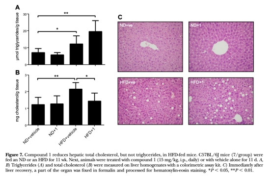 4. 肝臟脂質水平:測量了肝臟組織中的甘油三酯和膽固醇含量。研究意義是評估肝臟脂肪變性,化合物1降低了肝臟膽固醇,但對甘油三酯影響不顯著,提示短期治療可能未完全改變肝臟脂質積累。數據來自圖7。