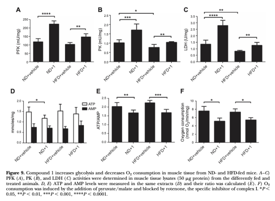 7. 線粒體呼吸:使用丹麥Unisense電極測量了肌肉組織的耗氧率(O2消耗)。研究意義是評估能量代謝變化,化合物1降低了耗氧率,表明線粒體呼吸抑制,與糖酵解增強一致。數據來自圖9。