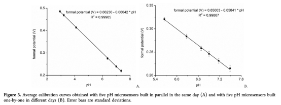 2. pH微傳感器的重現(xiàn)性數(shù)據(jù):通過五組傳感器測試,顯示系數(shù)變異≤3%,表明傳感器構(gòu)建一致。這些數(shù)據(jù)來自圖3,顯示了平均校準(zhǔn)曲線。研究意義:確保傳感器可重復(fù)使用,減少實(shí)驗(yàn)誤差,提高數(shù)據(jù)可靠性。