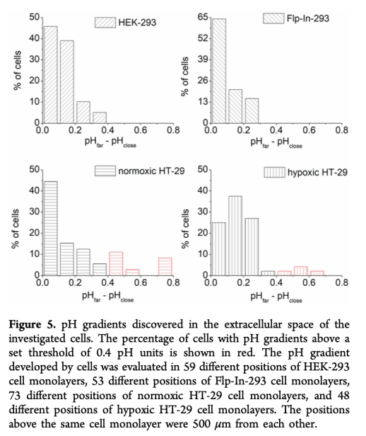 4. 細(xì)胞外pH測量數(shù)據(jù):測量了不同細(xì)胞類型的pHclose和pHfar,計(jì)算pH梯度。例如,缺氧HT-29細(xì)胞平均pHe為7.03,常氧HT-29為7.13,正常細(xì)胞為7.18-7.21,并顯示pH梯度分布。這些數(shù)據(jù)來自圖5,顯示了pH梯度的百分比分布。研究意義:揭示細(xì)胞異質(zhì)性,癌癥細(xì)胞具有更酸性細(xì)胞外空間,且缺氧細(xì)胞pH梯度更大,有助于理解癌癥細(xì)胞pH調(diào)節(jié)機(jī)制和異質(zhì)性對(duì)治療的影響。