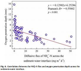 研究意義:圖6顯示,銨態氮通量與氧滲透深度呈顯著負相關。這從統計學上強有力地證實了沉積物-水界面的氧化還原條件是控制氮交換的關鍵因素。氧化性越強(氧滲透越深),氮釋放通量越低。