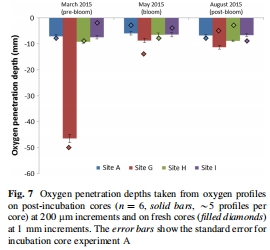 研究意義:圖4顯示擴散性氧氣吸收速率遠低于總氧氣吸收,且季節變化不如總氧氣吸收明顯。圖7和 圖8的剖面圖極具說服力地顯示,滲透性沉積物(站點G)的氧滲透深度極深(可達46毫米),而粘性沉積物的氧滲透深度很淺(<1毫米)。這直觀地展示了沉積物物理結構對氧氣輸送和氧化還原條件的決定性影響。淺的氧滲透深度意味著厭氧過程更接近界面,可能影響氮、鐵等其他元素的循環。