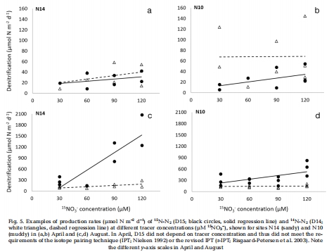 研究意義:圖5的關鍵結(jié)果表明,春季的反硝化速率測量不符合IPT技術(shù)的假設(D15與添加的15NO3-濃度無依賴關系),表明反硝化過程并非受硝酸鹽限制,而是受其他因素(如活性有機碳)限制。到了8月,測量有效,顯示反硝化速率在兩種沉積物間無顯著差異,且絕大部分(87-95%)的反硝化由沉積物內(nèi)部的硝化作用(Dn)支持。這直接證明了河流硝酸鹽的去除主要是一種間接的、耦合的過程,而非直接利用上覆水中的硝酸鹽。